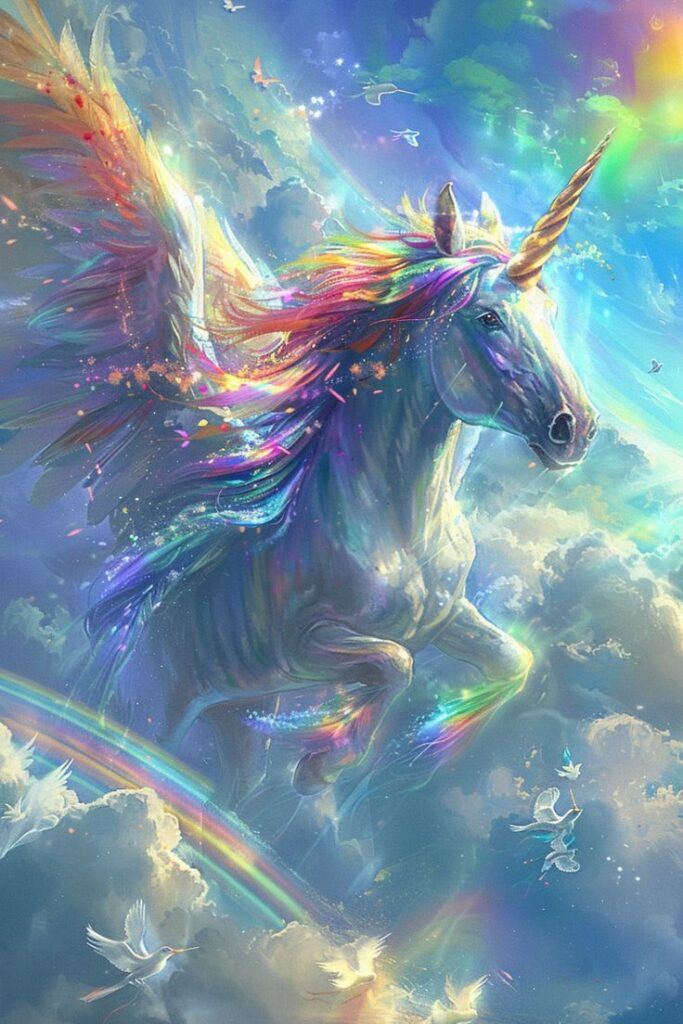 The idea of a flying unicorn likely stems from a blending of myths, particularly with the Greek myth of Pegasus. Pegasus is a winged horse that can fly, born from the blood of Medusa when she was slain by Perseus. Over time, the images and stories of Pegasus and unicorns have occasionally merged in popular culture, leading to the depiction of winged unicorns, often referred to as “pegacorns” or “alicorns.”