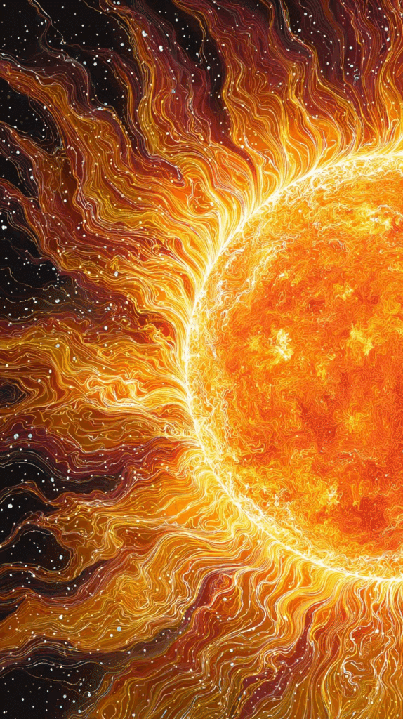 The Sun releases bursts of energy in the form of solar flares and coronal mass ejections (CMEs). These phenomena send charged particles into space and can affect satellites, power grids, and even cause spectacular auroras on Earth.