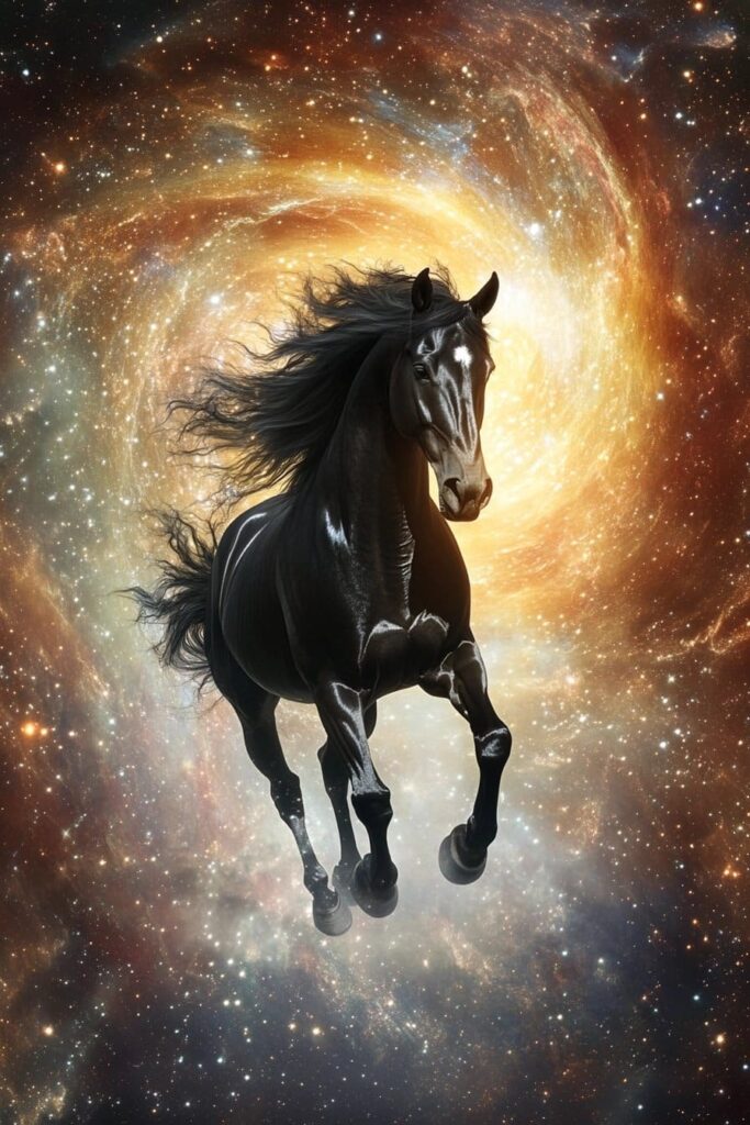A black horse in a dream often symbolizes the unknown or unexplored aspects of your life. It can represent your subconscious mind urging you to explore new territories or confront things you’ve been avoiding. This could be related to personal fears, hidden talents, or life changes that you might feel apprehensive about. The presence of a black horse suggests that there is something beneath the surface waiting to be acknowledged and understood.